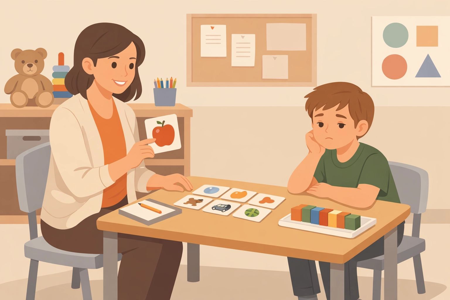 Traditional ABA therapy session showing therapist and child at table with flashcards